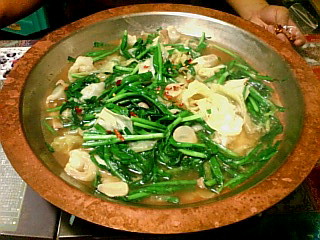 もつ、キャベツ、にら、ニンニク、唐辛子、ダシ、ラーメンが入って